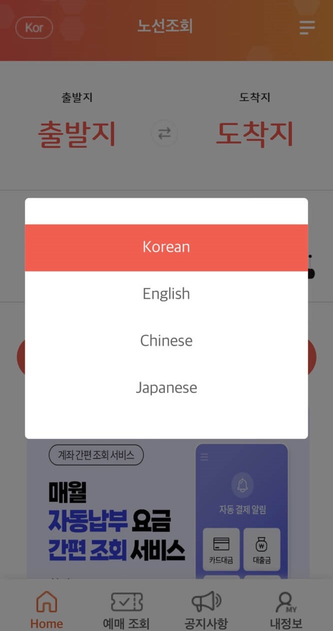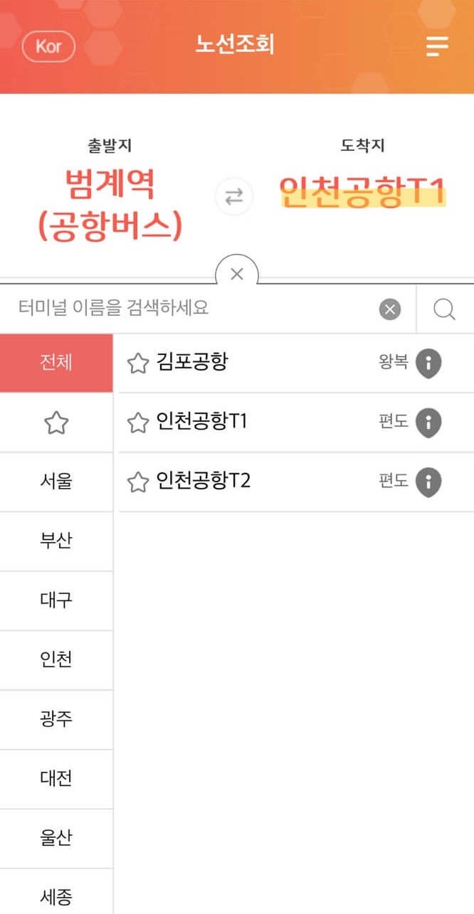 버스타고 앱 왼쪽 상단 kor 버튼을 선택하면 한국어, 영어, 중국어, 일본어 선택이 가능합니다. 공항버스 리무진 예약을 하시려면 로그인 후 이용하시는 것을 추천드립니다. 로그인 후 출발지와 도착지를 선택해 줍니다.