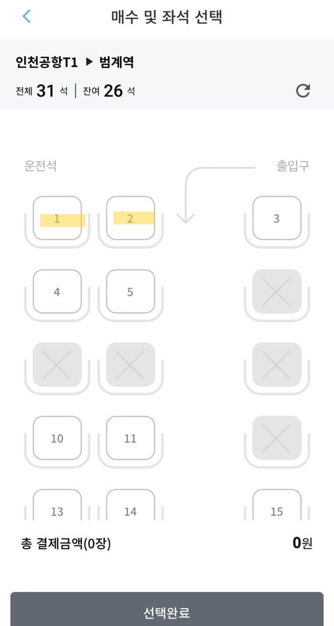 이용하시려는 시간대의 좌석을 확인하고 결제를 진행합니다. 티머니고의 공항 리무진 예매 시 모바일로 발권되지 않는 예매표는 인천공항에서 직접 발권을 해주셔야 합니다.