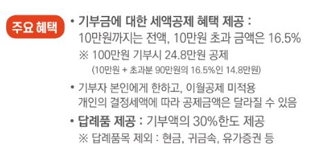 이 세액공제 혜택은 소득세와 지방소득세에서 적용되므로 기부자는 기부금에 비해 부담이 크게 줄어드는 효과를 누릴 수 있습니다 연말정산 시 기부금 영수증을 제출하면 세액공제가 적용되므로 반드시 발급받아 보관해야 합니다