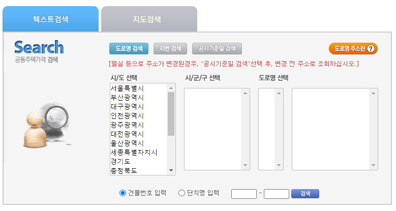 공동주택가격 공시지가 조회하는 예시입니다. 공동주택의 공시지가 조회는 텍스트 검색 또는 지도에서 검색 가능합니다. 텍스트 검색의 경우 도로명, 지번검색, 공시일 기준으로 검색 가능합니다.