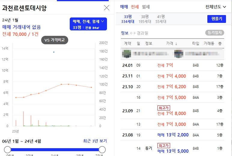 과천시 르센토 데시앙 단지로 23년 8월 13억 5천만으로 최고가 거래 되었으며, 전세는 푸르지오와 비슷한 7억원으로 거래되었습니다.