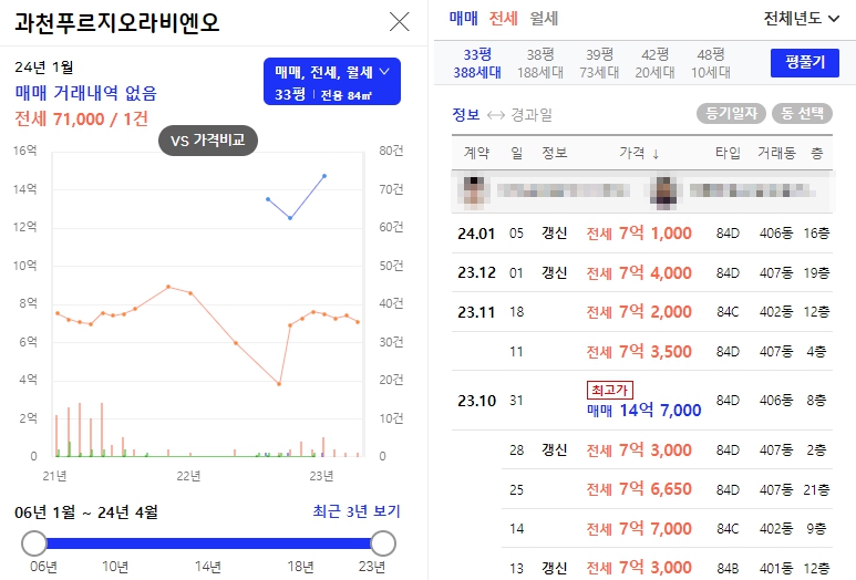 과천 푸르지오 라비엔오는 23년 10월 14억 7천만원 최고가 거래되었으며, 전세는 24년 1월에 7억 1천만원으로 거래되었습니다. 현재 무순위 청약 금액이 현재 전세가 수준으로 최소 6억 이상 시세차이를 기대해 볼 수 있습니다.