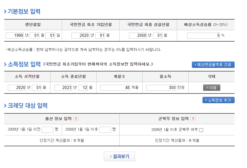 국민연급 최초 가입부터 현재까지의 소득정보만 입력가능합니다. 국민연금 예상 수령액 모의 결과 확인 기본 정보와 소득정보를 입력하면 국민연금 예상 수령액 확인이 가능합니다.