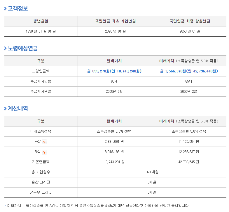 - 미래가치 : 고객님의 소득이 향후 5.0% 상승하여 국민연금을 받는 시점에서 예상되는 금액