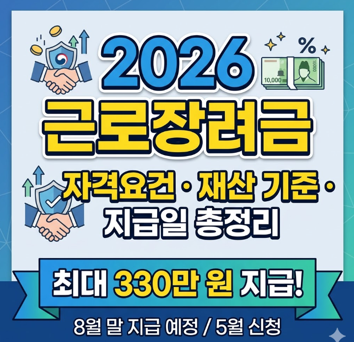 2026년 근로장려금 자격요건에 따르면 소득 기준은 단독 가구 2,200만 원, 맞벌이 4,400만 원 이하이며, 근로장려금 재산 기준은 가구원 합산 2억 4,000만 원 미만입니다. 5월 정기 신청자의 근로장려금 지급일은 2026년 8월 말로 예정되어 있습니다. 아래에서 상세한 자격 조건과 신청 방법을 확인하세요.