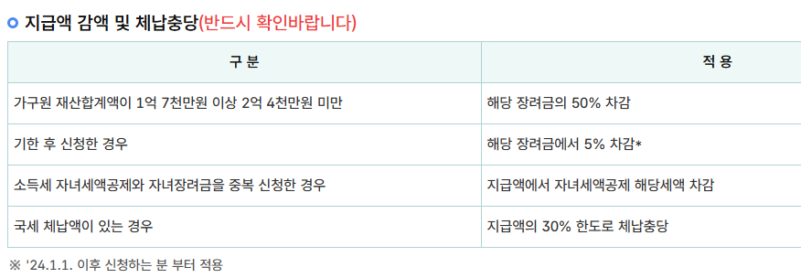 - 50% 감액: 재산 합계액 1억 7,000만 원 이상 ~ 2억 4,000만 원 미만