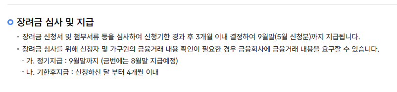 5월 이후에 신청하는 기한 후 신청의 경우 근로장려금 지급일이 10월 이후로 늦춰질 뿐만 아니라, 최종 지급액의 5%가 차감되므로 반드시 제때 신청하여 근로장려금 자격요건에 따른 혜택을 온전히 누리시기 바랍니다.