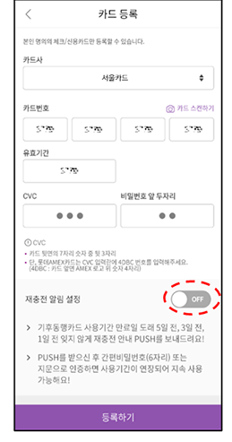 카드 등록을 시 재충전 알림을 설정할 수 있습니다. 기후동행 카드 사용기간 5일전, 3일전, 1일전 잊지 않게 재충전 안내를 받으실 수 있습니다.