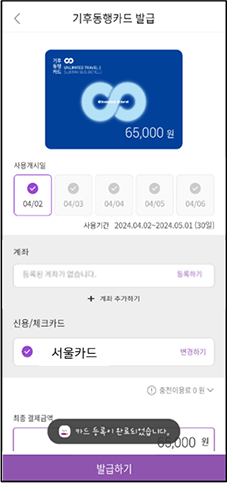 기후동행카드 사용 게시일을 선택하고 충전 시 계좌를 등록하거나 신용 체크 카드를 등록해줍니다.