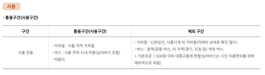 - 기본요금 1,500원 이하 대중교통에 한함(심야버스는 시민 이용편의를 위해 예외적으로 허용)