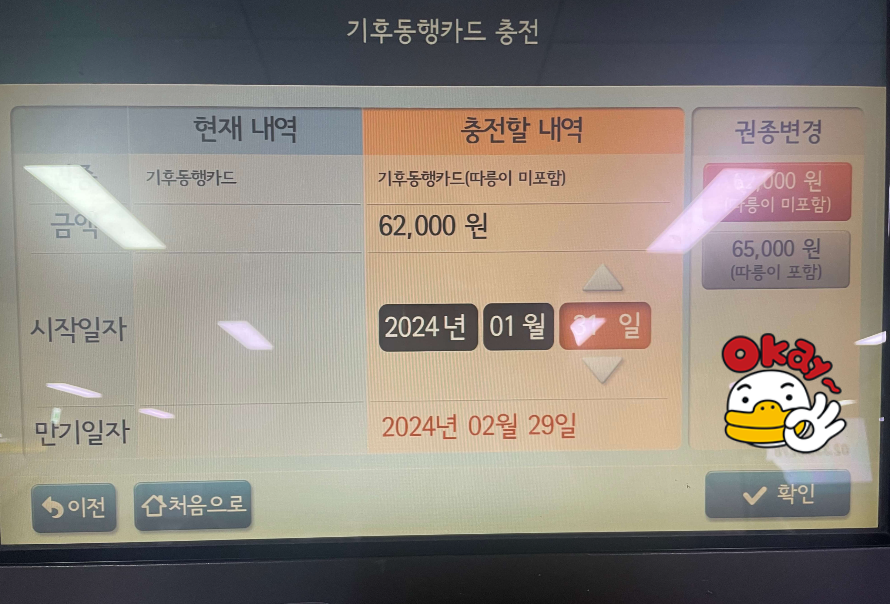 기후동행카드 충전시 권종 변경 선택을 하고, 62,000원 (따릉이 미포함), 65,000원(따릉이 포함) 충전 시작일을 선택하면, 만기일자가 자동으로 표시됩니다.