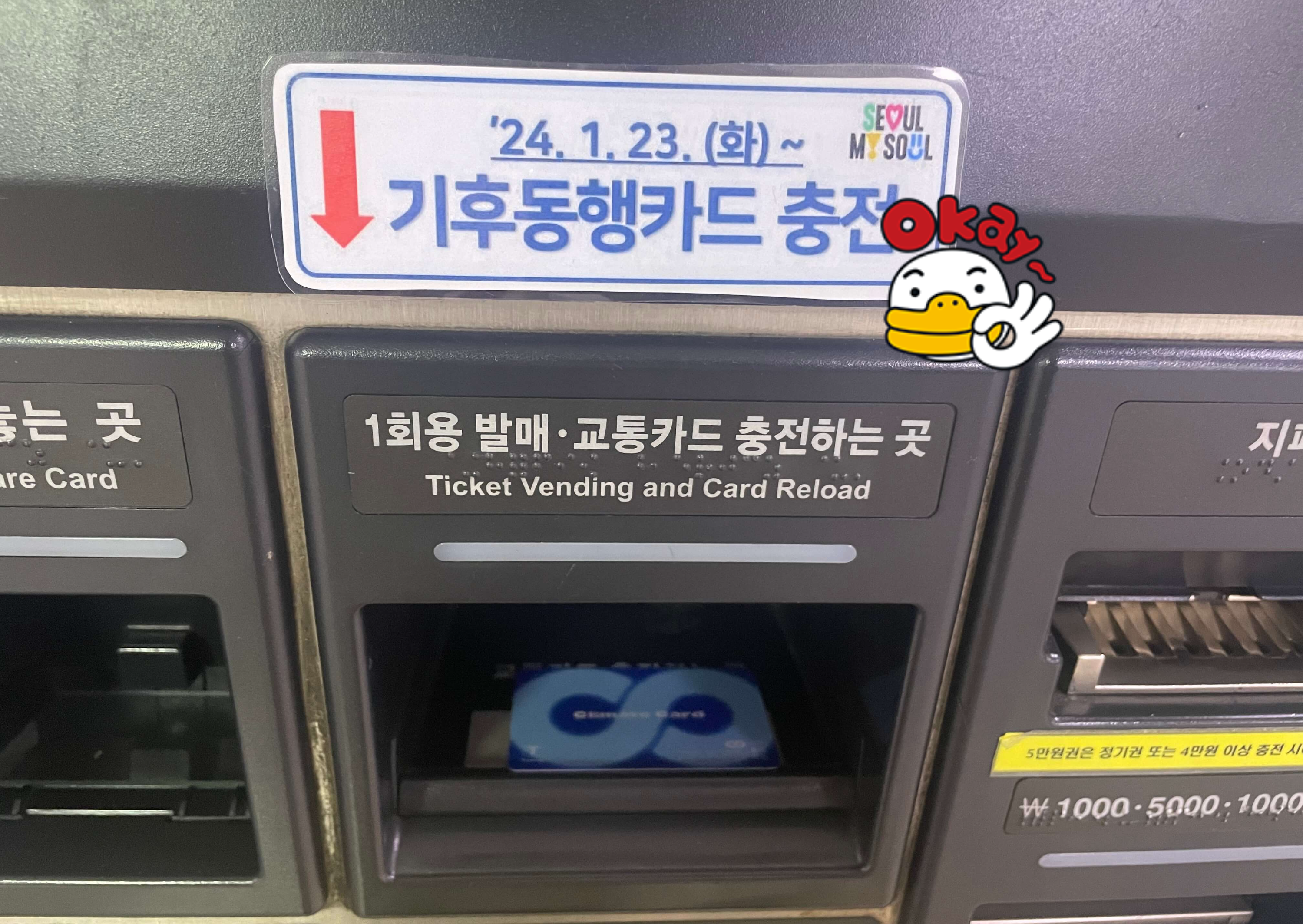 기후동행카드 충전이 가능한 충전소에는 1회용 발매 교통카드 충전하는 곳에 기후동행카드 충전이라는 스티커가 부착되어 있습니다. 충전기 화면에 교통카드 충전을 누르시고 교통카드 충전하는 곳에 기후동행카드를 올려줍니다.