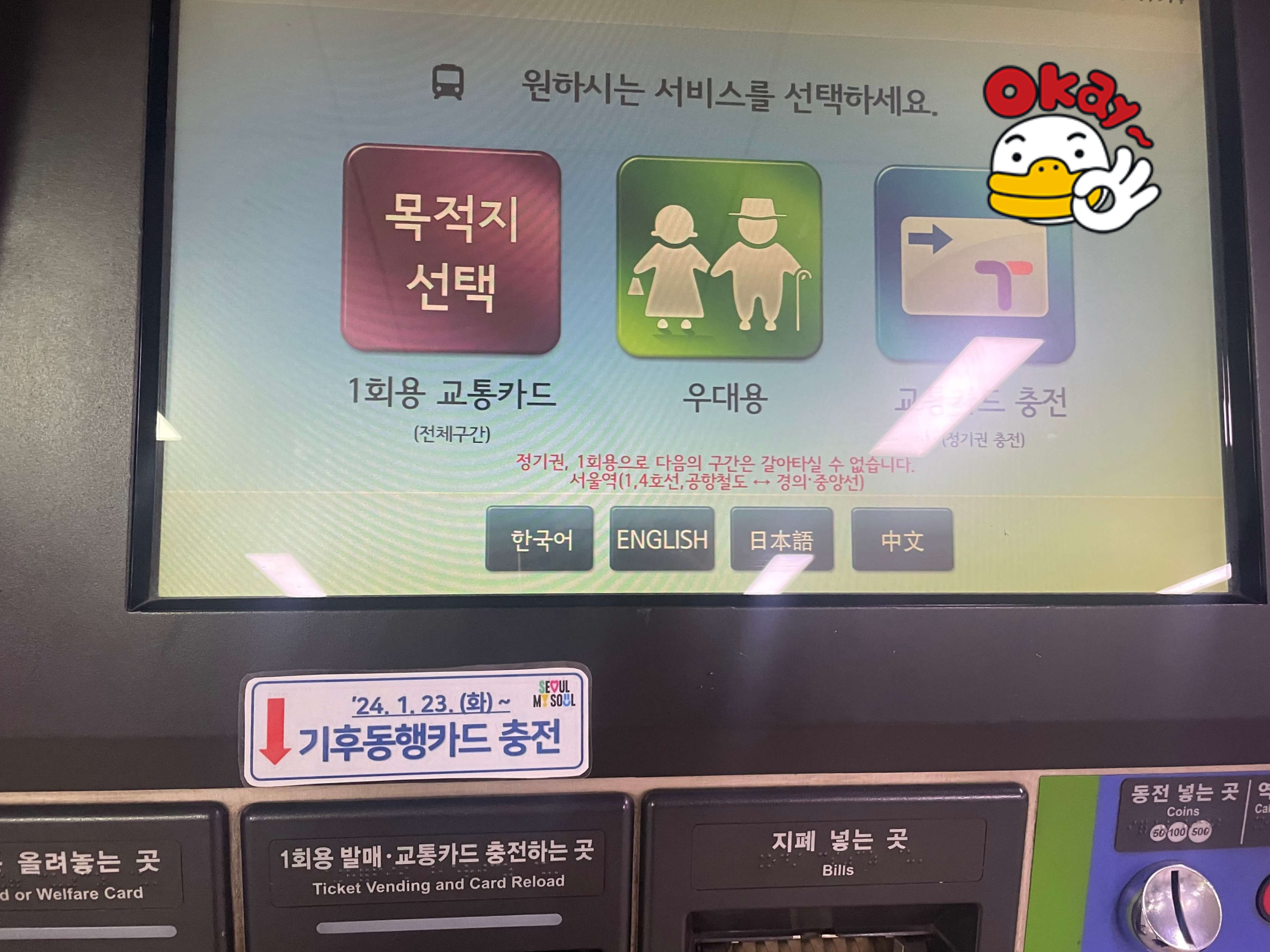 기후동행카드 충전 금액을 넣을 때는 시간 제한이 있어 지폐가 제대로 들어가지 않아 시간이 지연될때는 시간 연장 버튼을 눌러주시면 됩니다.