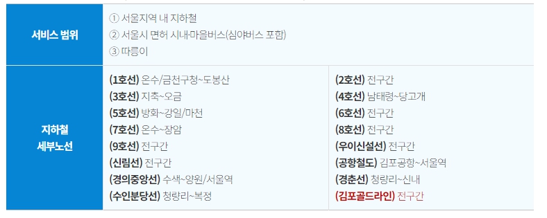 예외적으로 서울시계 내 역에서 승차 후, 4호선(별내별가람~진접), 5호선(미사~하남검단산), 7호선(석남~까치울), 진접선(전구간)에서 하차는 가능하지만 승차는 불가합니다.