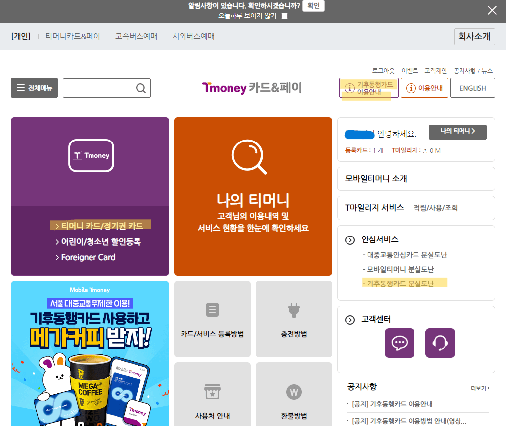 - 환불방식: 기후동행 실물카드의 경우 사용만료일+15일 이내 '티머니카드&페이'홈페이지에서 환불 신청 및 계좌입력을 하면 5일 이내 개인 계좌로 환불금이 입금 처리됩니다.