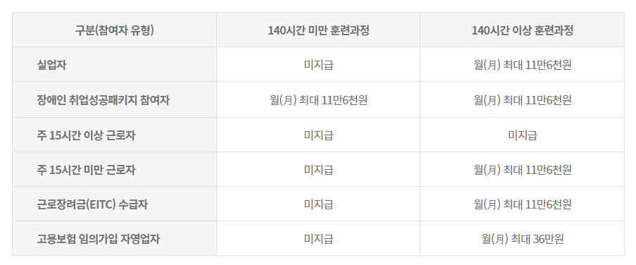 - 140시간 이상 훈련과정 수강하는 자영업자인 고용보험 피보험자(월 최대 36만 원)
