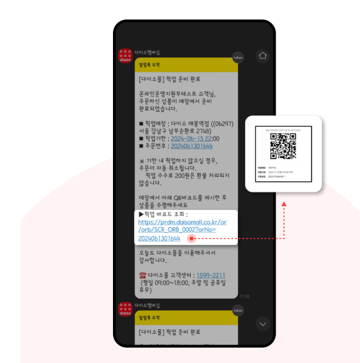 픽업 상품은 오후 1시부터 수령가능하며 주문 후 3시간 이후부터 수령 가능합니다. 상품 준비가 완료되면 QR 코드가 발송됩니다. 수신한 QR코드를 매장 직원에게 보여주면 상품 수령이 가능합니다.