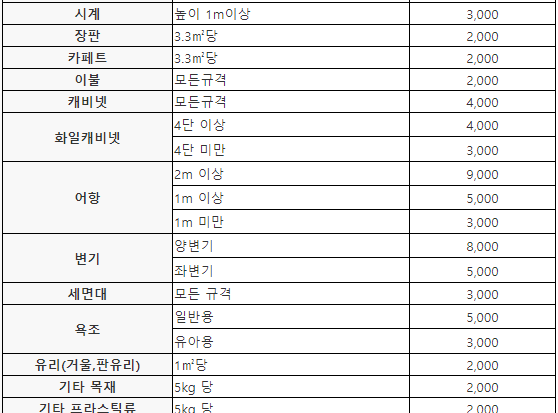 - 신발장 1m이상 5,000원/ 1m 미만 2,000원