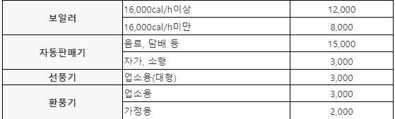 - 식탁(테이블) 4인용이상 5,000원 / 3인 이하 2,000원