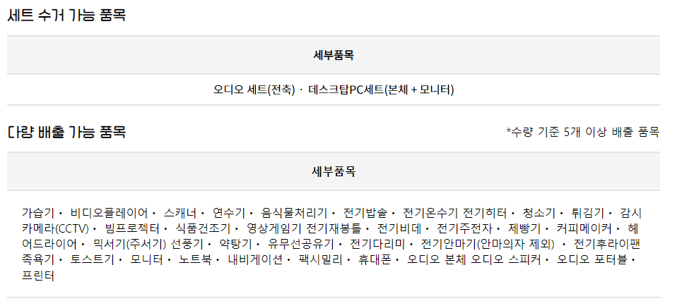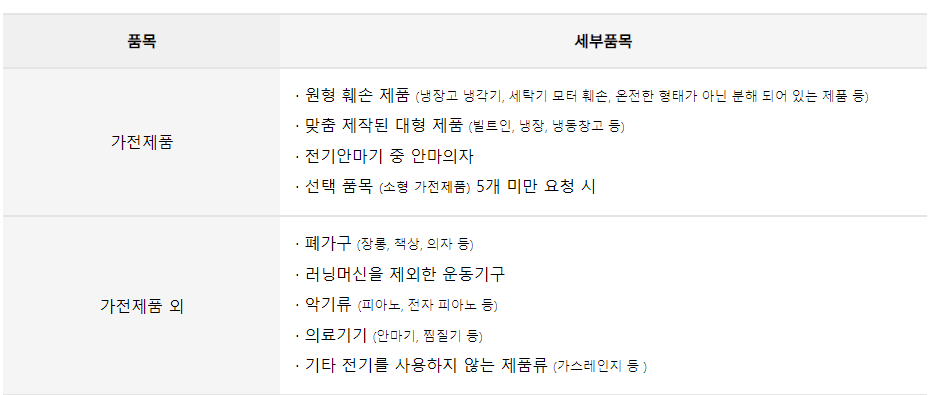 맞춤 제작된 빌트인 제품이거나 안마의자 등은 수거가 불거하며, 가전제품 이외 폐가구, 러닝머신을 제외한 운동기구, 악기류 등 전기를 사용하지 않는 제품은 수거가 불가합니다.