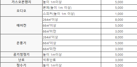 | 텔레비전 | 42인치 이상 25인치 이상 25인치 미만 TV받침일체형(40인치 미만) |