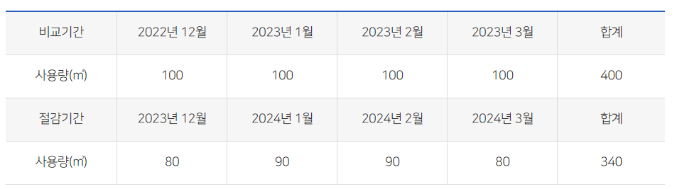 - 비교기간 사용량(400㎥), 절감기간 사용량(340㎥), 절감량(60㎥)