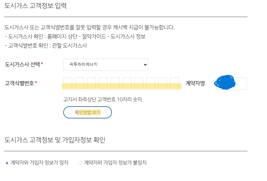 4. 개인 정보 입력 시 주소는 실제 도시가스를 사용하는 주소지로 입력하고, 도시가스 고객 정보를 입력해 줍니다.