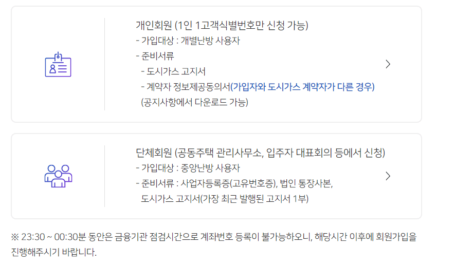 2. 회원 가입은 개인회원, 단체 회원으로 구분되며, 도시가스캐시백 신청시 준비 서류가 필요합니다.