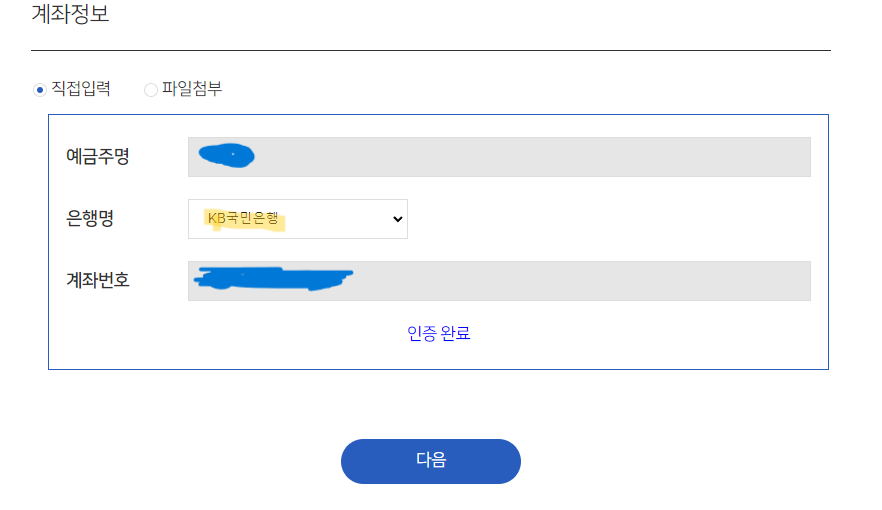 5. 마지막을 환급받을 계좌를 입력하고 계좌번호를 인증해줍니다.