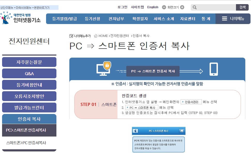 본인 소유의 등기부 등본을 발급 시 수수료를 면제받기 위해서는 등기부등본 인터넷 모바일앱에서 인증서 확인이 필요합니다. 먼저 인터넷 등기소 PC에서 로그인 후 전자민원센터에서 PC->스마트폰 인증서를 복사 후 인터넷등기소 모바일앱서 인증서 저장하기를 완료해야 합니다.