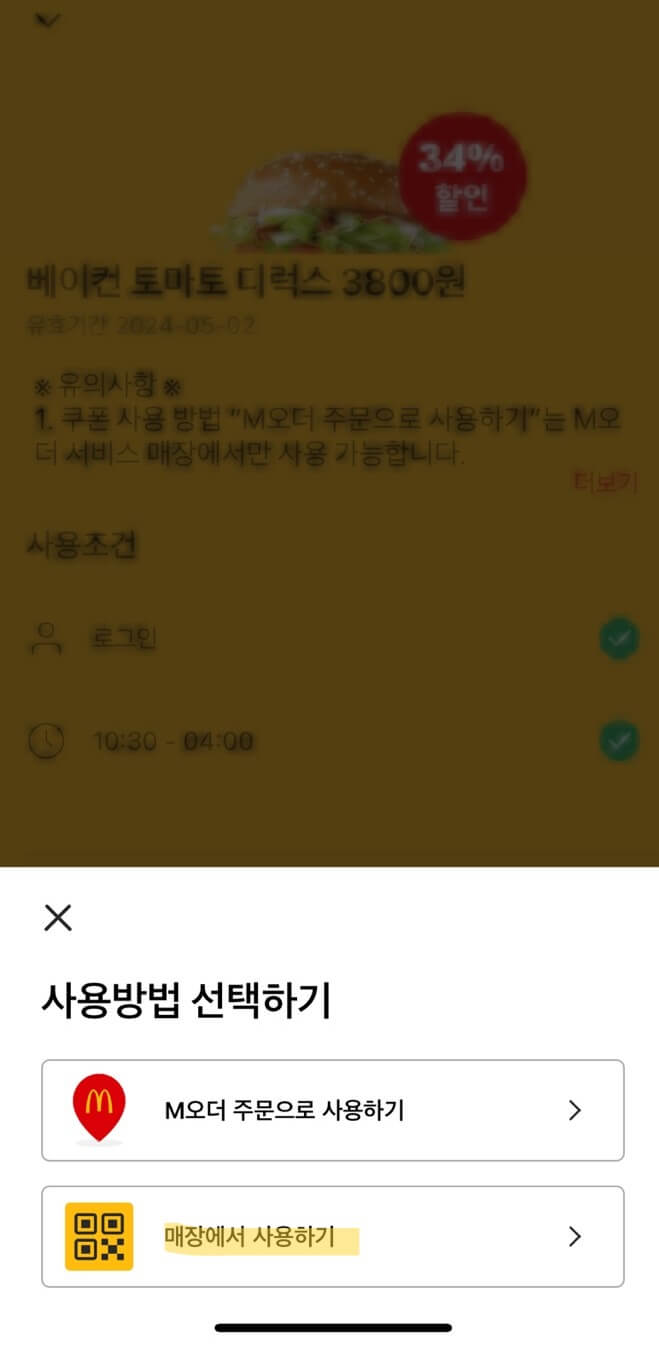 맥도날드 매장에서 바로 쿠폰을 사용하시려면 내 쿠폰함에서 사용하실 쿠폰을 선택한 후 사용방법을 매장에서 사용하기를 선택합니다.
