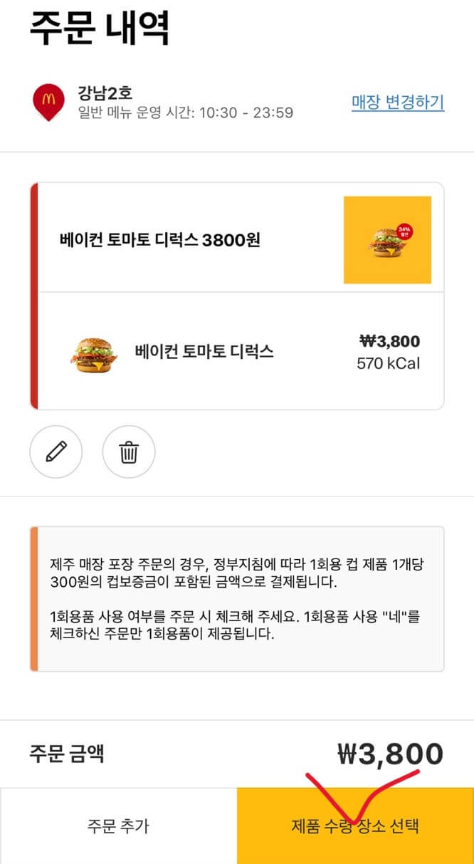 주문내역에서 함께 주문할 메뉴를 추가하거나 더 주문할 메뉴가 없다면 제품 수령 장소를 선택합니다. 매장에 따라 카운터로 받기와 테이블에서 받기 선택이 가능합니다. 주문한 매장 정보를 한번 더 확인 후 주문금액을 앱에서 결제를 완료해주시면 됩니다.