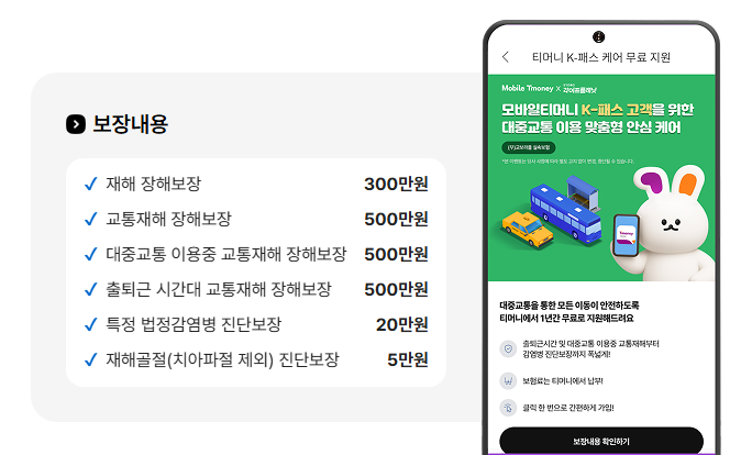 또한, 재해 및 대중교통 이용 중 사고에 대해 최대 500만 원까지 보장되는 '대중교통 무료보험'이 1년간 지원됩니다. 이 모든 혜택은 모바일티머니 K패스 신청방법을 정상적으로 마친 분들에게만 제공됩니다.