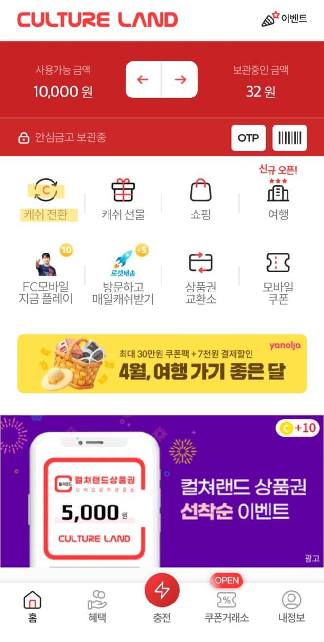 컬쳐랜드 앱을 다운로드 받으시면, 네이버페이 스마일캐시, SSG 머니 이외에도 쿠팡캐시, 페이코, 해피포인트 캐시 전환이 가능합니다.