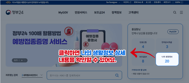 또한 정부24 홈페이지에서도 민방위 교육훈련일 등 병역과 관련된 생활정보를 확인할 수 있습니다. 그럼 민방위 훈련 조회방법에 대해 자세히 알아보겠습니다.