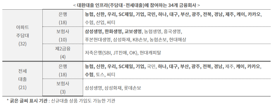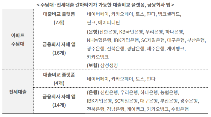 1.9일 기준, 아파트 주담대·전세대출 대환 인프라에는 총 7개의 대출비교 플랫폼과 34개의 금융회사(주담대 32개, 전세대출 21개, 중복 제외)가 참여하며, 향후 더욱 확대될 것입니다.