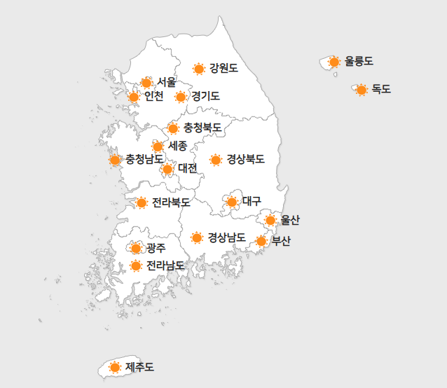 메뉴에서 해와 달이 뜨고 지는 시각 메뉴를 선택하면 지도에서 원하는 지역의 일출 일몰 시간을 확인하실 수 있습니다.