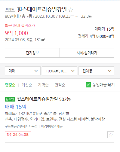 현재 힐스테이트 리슈빌 강동의 30평매 매매 물건은 나와있지 않으며, 24년 3월 7억 9천에 실거래 되었습니다.