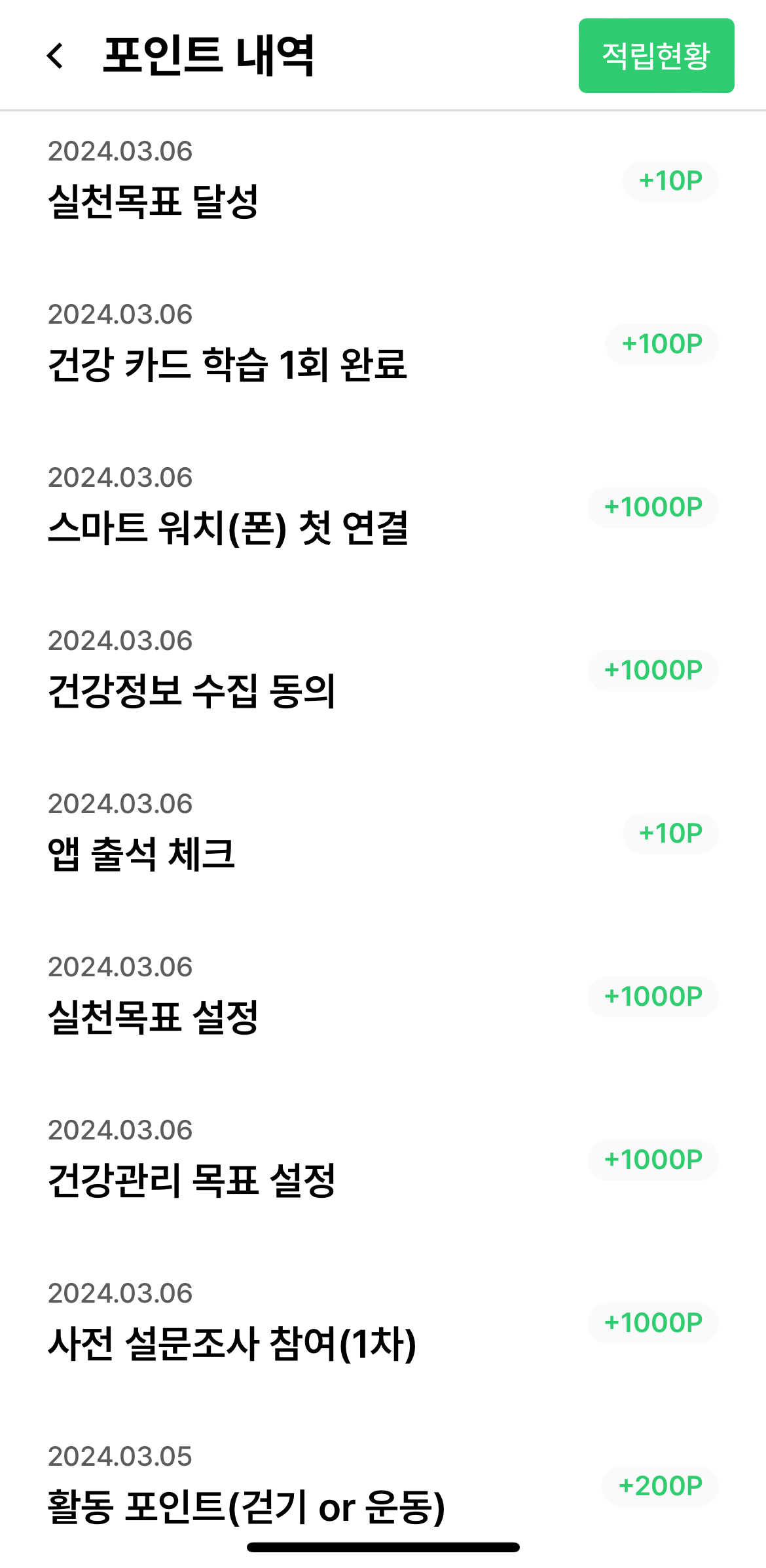 매일 적립 가능한 포인트 앱 시작과 동시 5000포인트 적립이 가능하고 매일 걷기 활동 200포인트와 식단기록(2끼 이상) 50 포인트, 실천목표달성 10포인트, 건강카드 학습 1회 100포인트, 앱 출석체크 10 포인트 총 370 포인트가 적립됩니다.