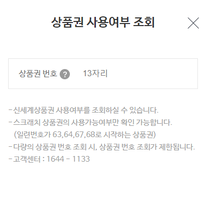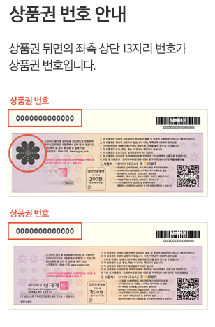 상품권 뒤면의 좌측 상단 13자리 번호로 상품권 조회가 가능합니다. 스크래치 상품권의 사용가능 여부만 확인가능한데요, 일련 번호가 63,64,67,68로 시작하는 상품권에 경우 확인 가능합니다. 다량의 상품권 번호 조회 시 조회가 제한될 수 있습니다.