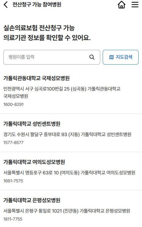 실손 험24 앱 내 참여 병원 지도를 통해 가까운 청구 가능 병원을 쉽게 찾을 수 있습니다. 또한 네이버, 카카오, 토스 등의 플랫폼에서도 실손보험24 참여 병원 정보를 제공하고 있어 위치에 따라 청구 가능 병원을 확인하는 데 도움이 됩니다. 네이버와 카카오 등을 통한 참여 병원 지도 공개되어 쉽게 병원을 찾아 보실 수 있습니다.