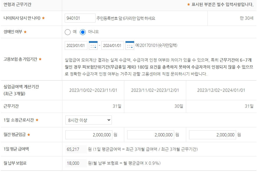 실업급여 계산기는 단순히 사용자가 입력한 정보를 바탕으로 모의계산을 해주는 것이므로, 실제 수급일 수와 지급액과는 차이가 있을 수 있습니다. 또한, 고용보험 피보험자격 다수이력자는 모의계산이 불가능합니다.