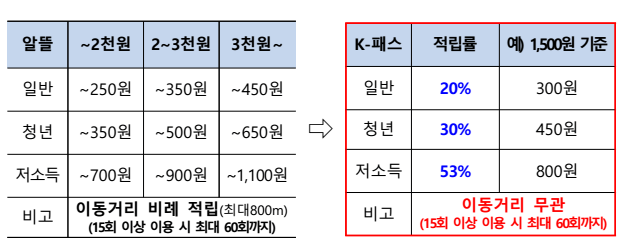 K패스 교통카드 개선점 기존의 알뜰 교통카드의 경우 도보ㆍ자전거 등 이동거리에 비례하여 마일리지가 환급되어 출발과 도착 기록이 필요합니다. 알뜰 교통카드 앱에서 출발과 도착 버튼을 눌러 기록을 해야 되는 반면, 개선되는 K패스 교통카드는 이동거리 관계없이 지출금액의 일정 비율 환급되어 출도착 기록을 하지 않아도 됩니다.