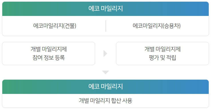 에코마일리지는 건물과 승용차에서 발생하는 탄소배출을 줄이고 에너지를 절약하는 노력을 인정하고 보상하는 제도입니다. 2022년 12월부터 에코마일리지 건물과 에코마일리지 승용차 홈페이지 운영이 통합되어 개별 마일리지를 합산하여 상용 가능합니다.