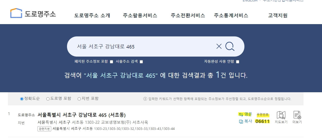 우편번호는 행정안정부 도로명 주소 홈페이지에서도 주소입력시 확인하실 수 있습니다.