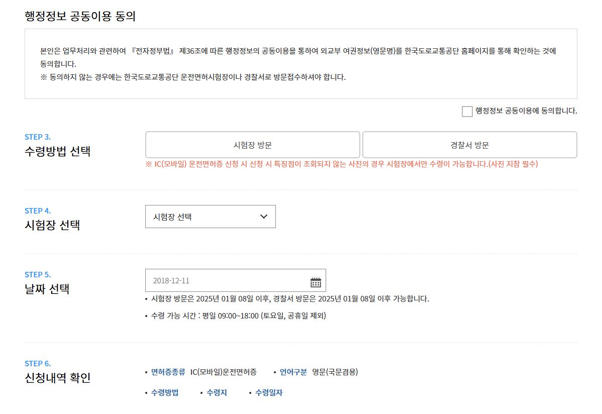 5. 면허증 갱신 시 운전면허 시험장과 경찰서에서 수령하실 수 있습니다. 가까운 방문장소와 수령가능한 날짜를 선택해 줍니다. 수령가능시간은 주말 제외 평일 9시부터 오후 6시까지 입니다.