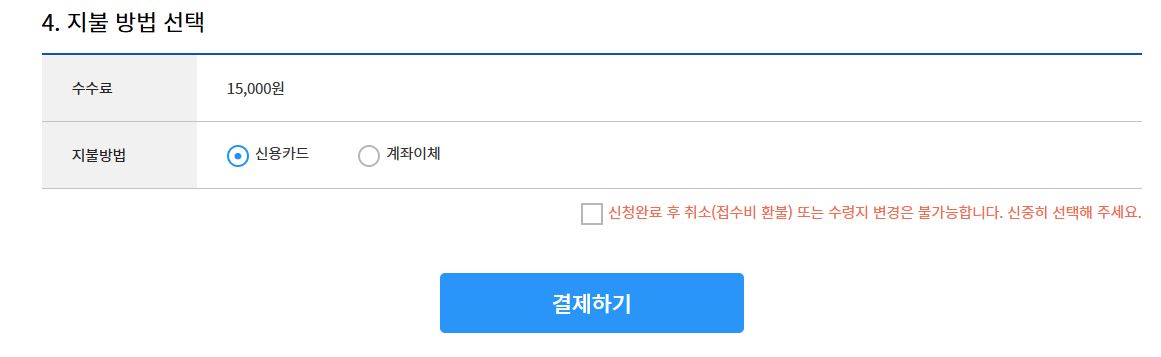 6. 운전면허 갱신 신청내역을 확인 후 수수료 확인 후 지불 방법을 선택하고 결제를 완료하면 운전면허 갱신 온라인 신청이 완료됩니다.