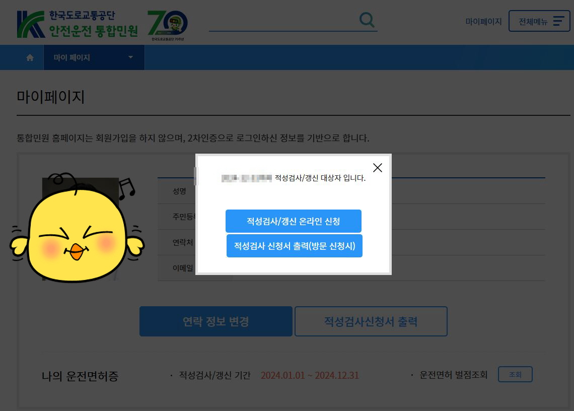 1. 운전면허 갱신 기간에 로그인을 하면 적성검사/갱신 대상자 확인이 가능합니다.
