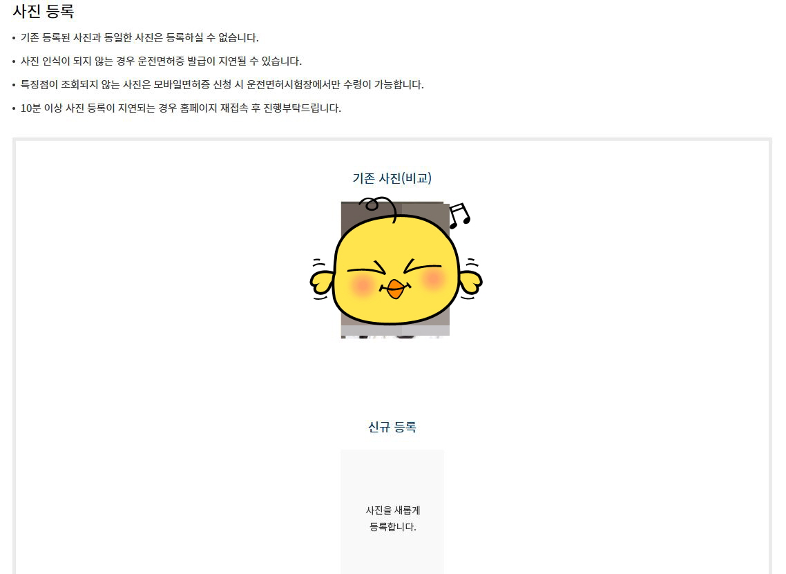 3. 운전면허 갱신 시 기존 사진과 비교하여 기존과 다른 새로운 사진을 온라인으로 등록합니다. 사진 등록시 가로 350, 세로 450 픽셀의 사진을 사용해야 합니다.