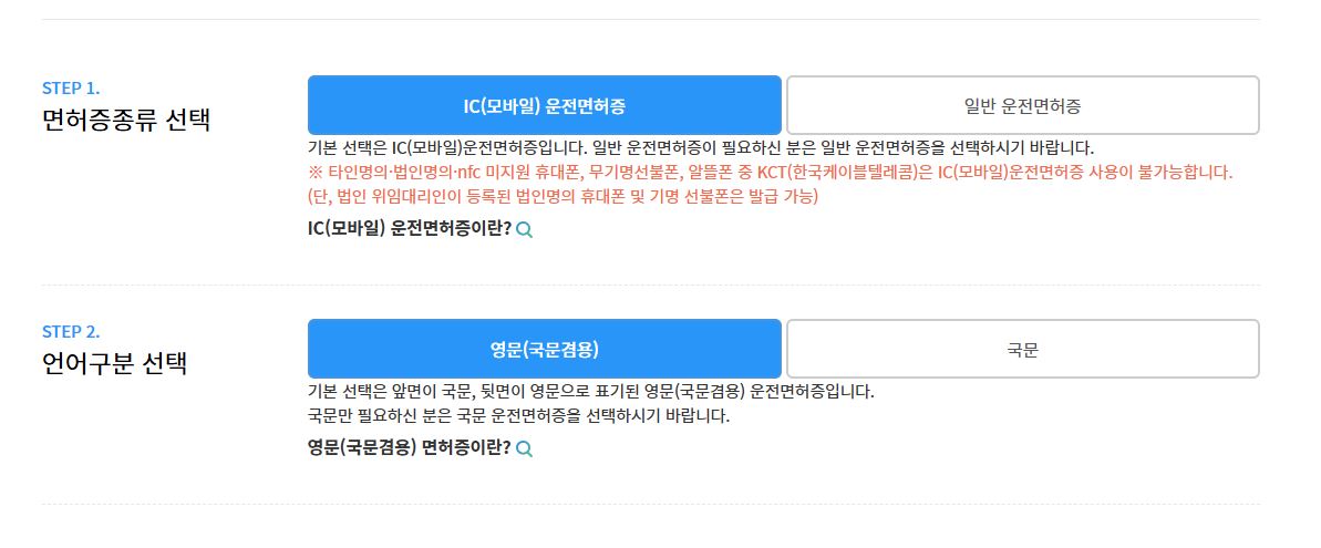 4. 운전면허증 갱신시 IC 모바일 운전면허증과 일반 운전면허증을 선택할 수 있습니다. 또한 뒷면이 영문으로 표기되는 영문(국문 겸용) 운전 면허증 언어 선택도 가능합니다 .